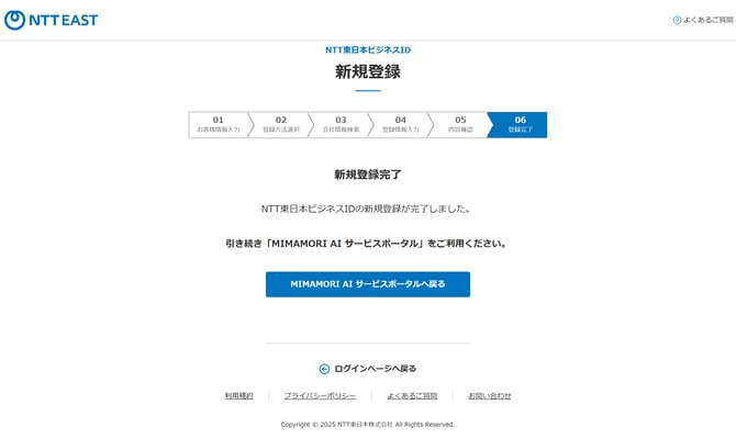 - 以下のような表示画面が出れば「NTT東日本ビジネスIDの登録」は完了です。
