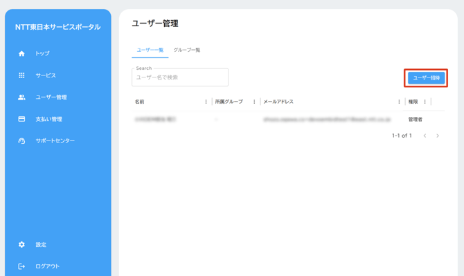 - ユーザ管理が表示されるため、「ユーザ一覧」を確認の上、「ユーザ招待」をクリックする。