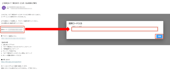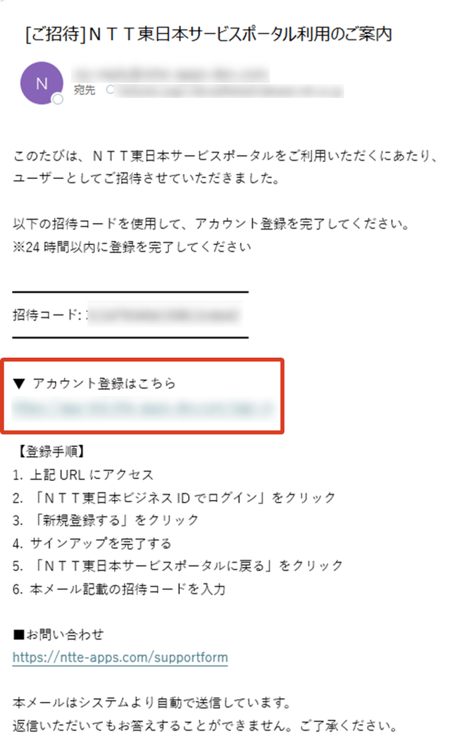 「招待コード」は控えておき、「アカウント登録はこちら」に記載のURLをクリックする。件名:「ご招待」NTT東日本サービスポータル利用のご案内
