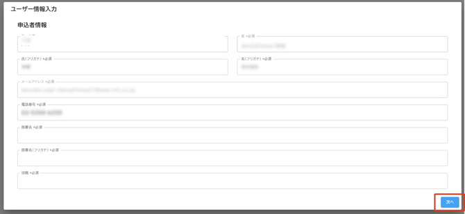 - お申込みに必要な情報が不足しているため、入力されている誤りが無いか、ご確認お願いいたします。入力内容に誤りが無いか確認の上、「次へ」をクリックします。