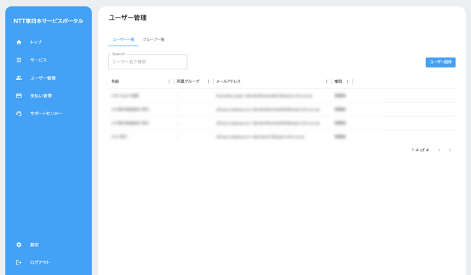 - サービスポータルトップ画面から、「ユーザ管理」をクリックする