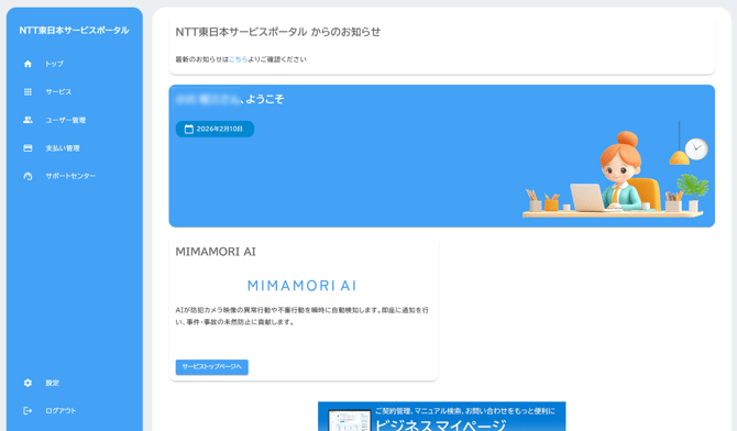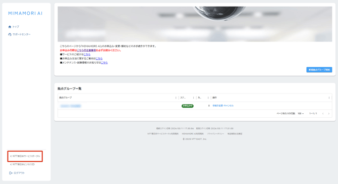 - NTT東日本ビジネスIDでログインし、MIMAMORI AIサービスページトップ画面左下の「NTT東日本サービスポータル」をクリックします。