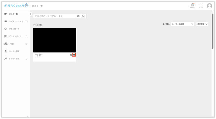 • カメラ一覧からMIMAMORI AI を利用するカメラの歯車マークをクリックし、設定画面を開きます。