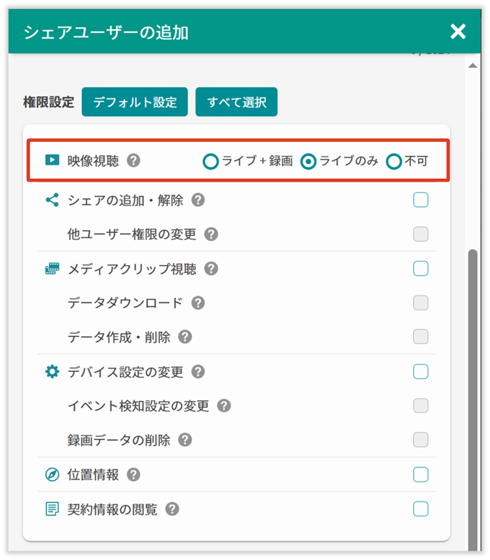 • 「映像視聴」のうち、「ライブのみ」を選択します。