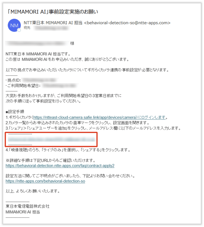 お申込み後、ご利用開始希望日の3営業日前までにお客様ご自身でギガらくカメラの連携設定を行っていただく必要があります。お申込みいただいたすべてのカメラに対して、以下の設定を行ってください。