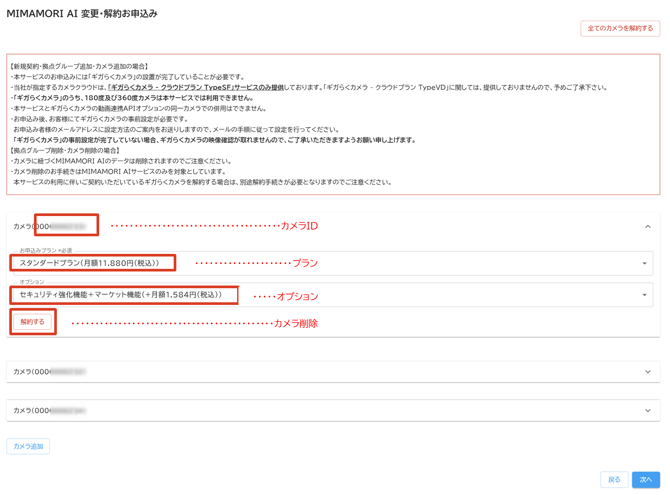 • カメラの一覧から申込みを行うカメラIDを確認し、プランの選択、オプションの選択、「カメラの追加」もしくは「解約する」ボタンをクリックします。