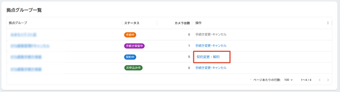 • 拠点グループ一覧から変更を行いたい拠点グループの「契約変更・解約」をクリックします。