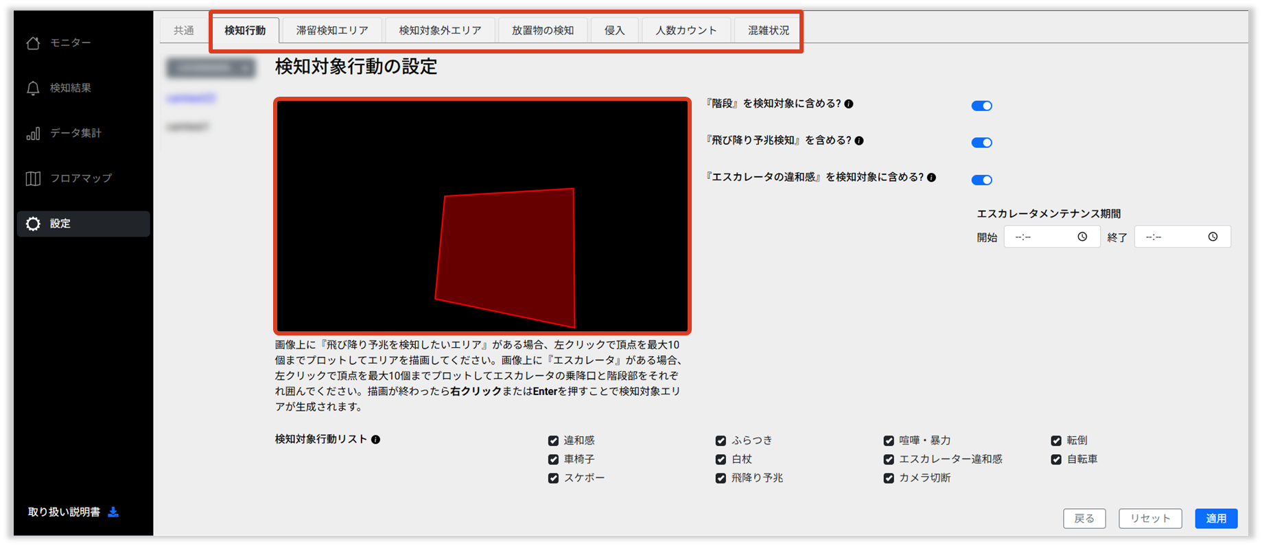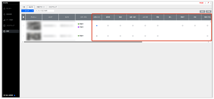 検知がされない 検知設定が有効になっているかご確認ください。 VMSの[設定]>[カメラ]より対象のカメラで検知項目がONになっているかご確認ください。 対象のカメラにおいて検知エリアが正しく設定されているか、もしくは検知対象外エリアが設定されていないかご確認ください。 VMSの[設定]>[カメラ]より対象のカメラにチェックをいれて、「設定」をクリック 各検知項目のタブを選択し、エリア設定を確認