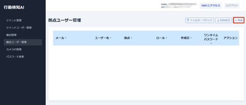 管理者権限のテナントユーザーもしくは拠点ユーザーで新規拠点ユーザーの登録ができます。